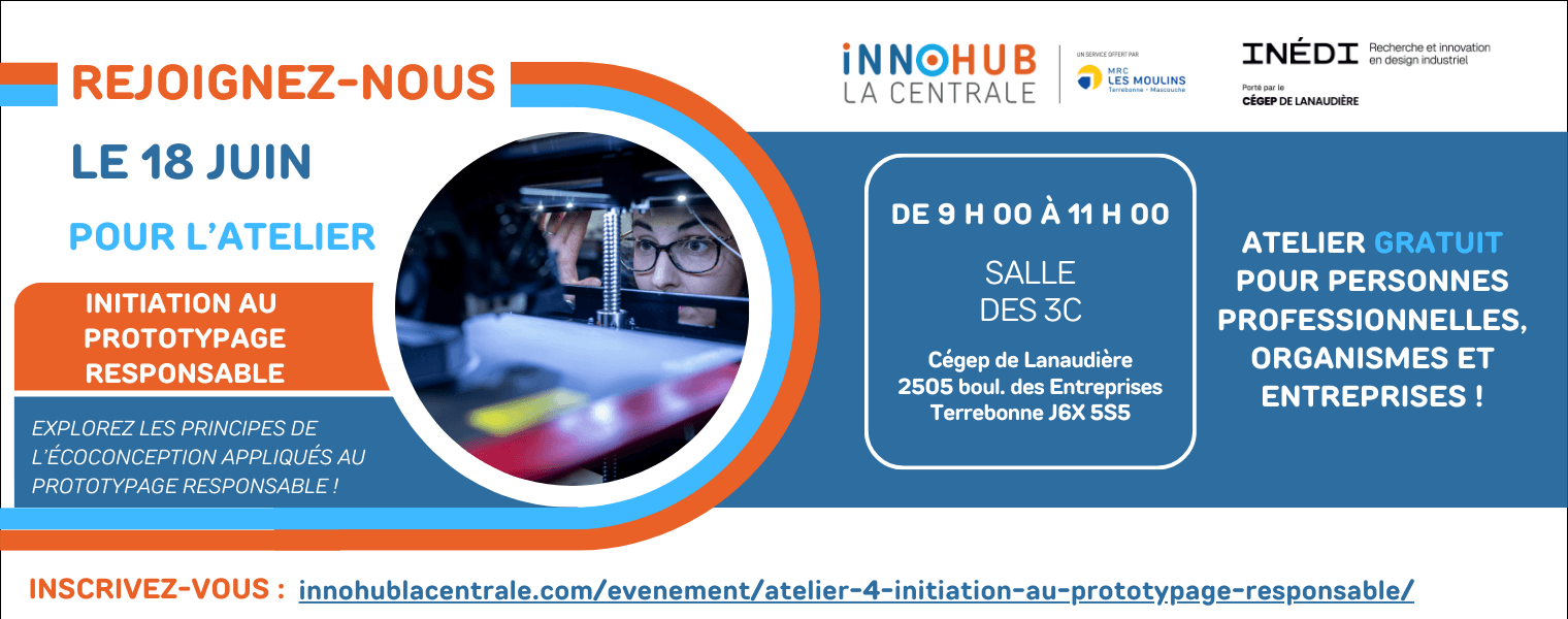 Dans ce dernier atelier, explorez les principes de l’écoconception appliqués au prototypage responsable. Pendant deux heures, vous serez initié aux technologies de fabrication additive et à d’autres méthodes innovantes pour créer des prototypes en minimisant les impacts environnementaux. Cet atelier vous permettra de découvrir les multiples possibilités qu’offre le prototypage responsable, tout en favorisant l’innovation durable dans vos processus de conception.