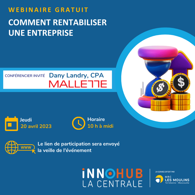 Dany Landry, de la firme Mallette, vous sensibilisera sur les facteurs clés de succès des entreprises et vous donnera la recette pour augmenter vos profits . Cet atelier interactif s’adresse à des entrepreneurs, propriétaires et dirigeants d’entreprises, aux personnes responsables de négocier des prix et à toutes autres personnes préoccupées par la rentabilité de l’entreprise.
